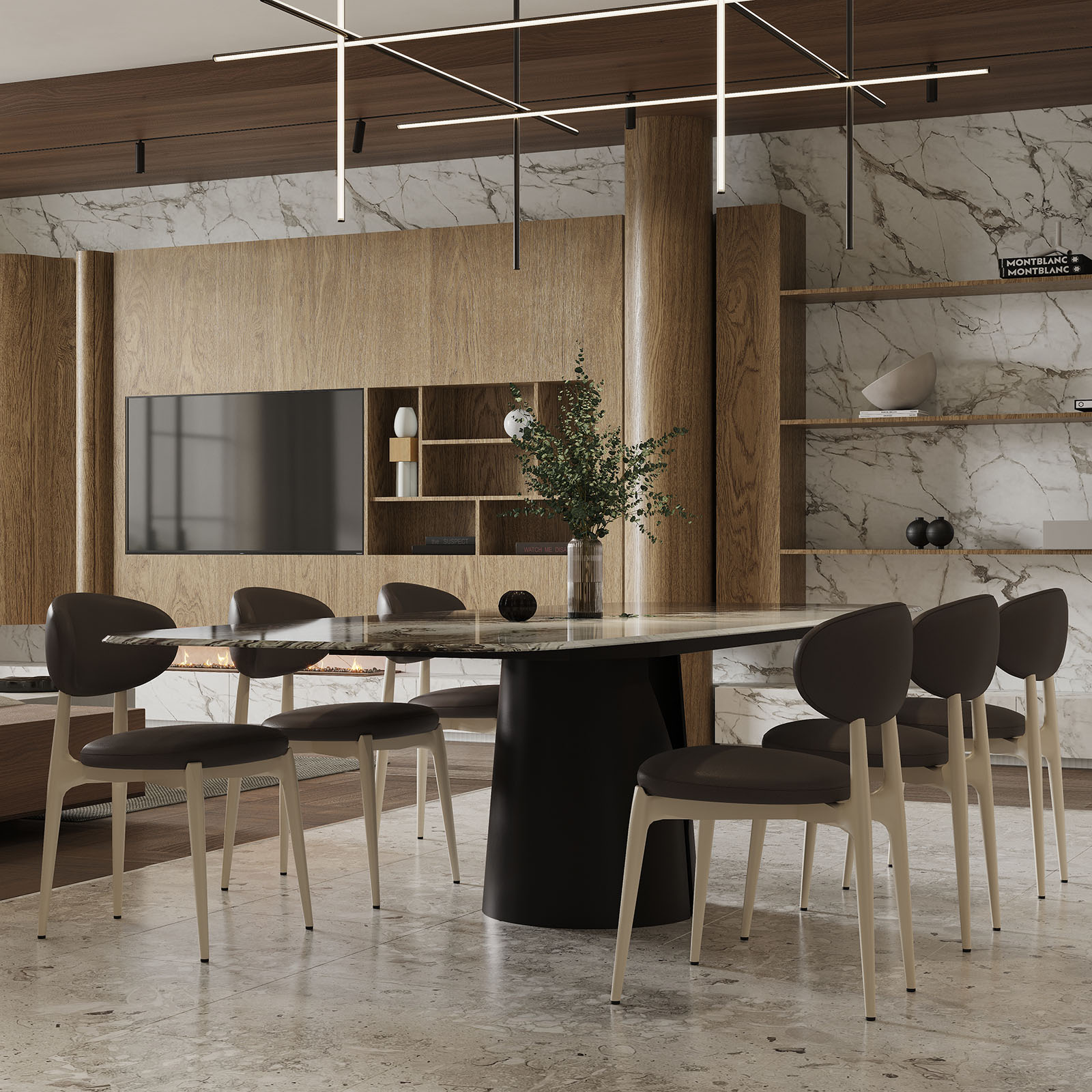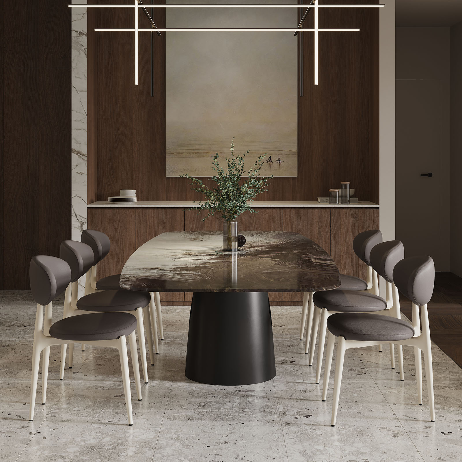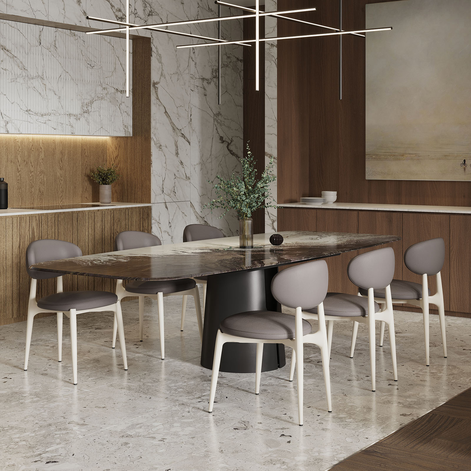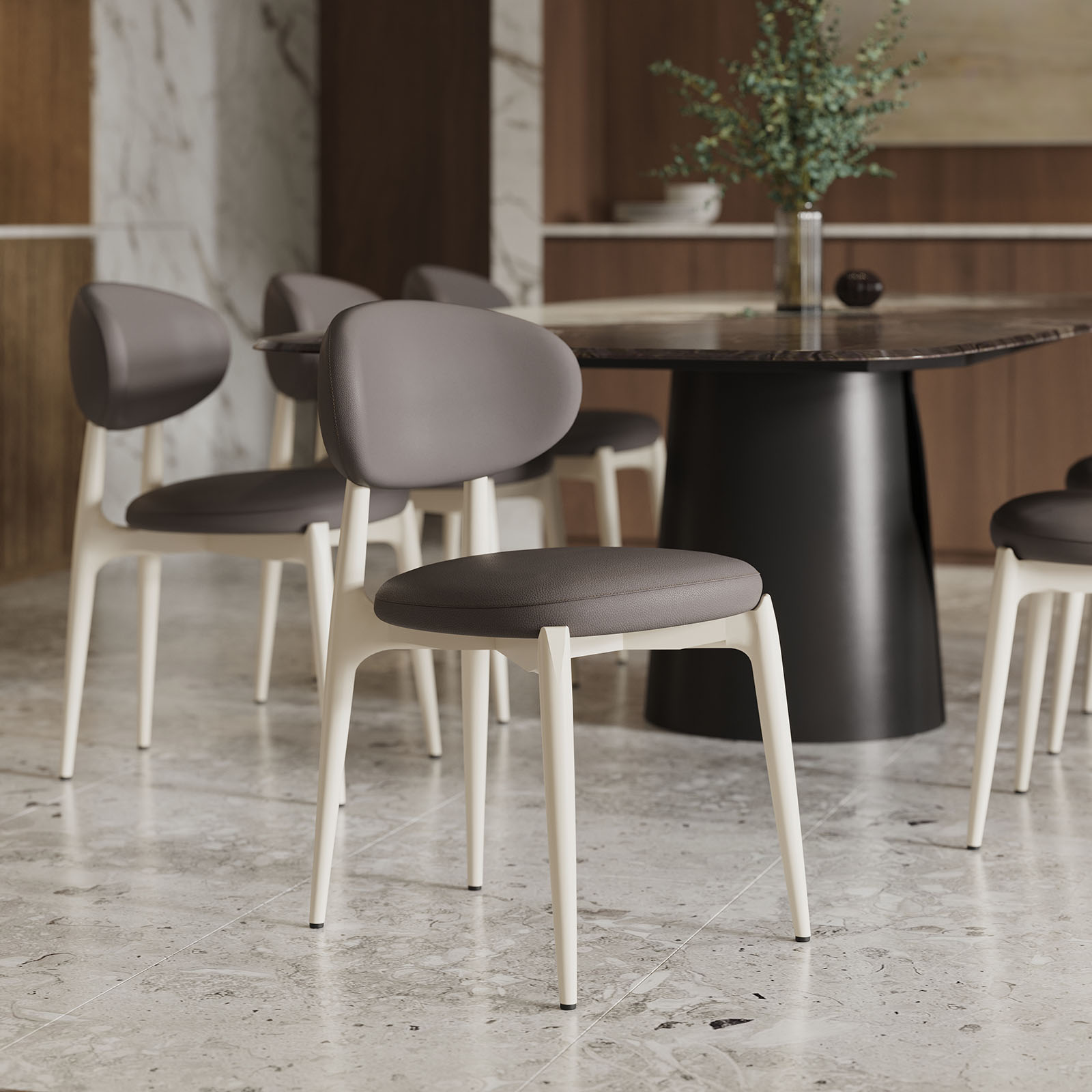 Модель хорошо сочетается с современными столами, натуральными фактурами, светлыми и тёплыми интерьерами, а также с более графичными сценариями, где нужен спокойный баланс.