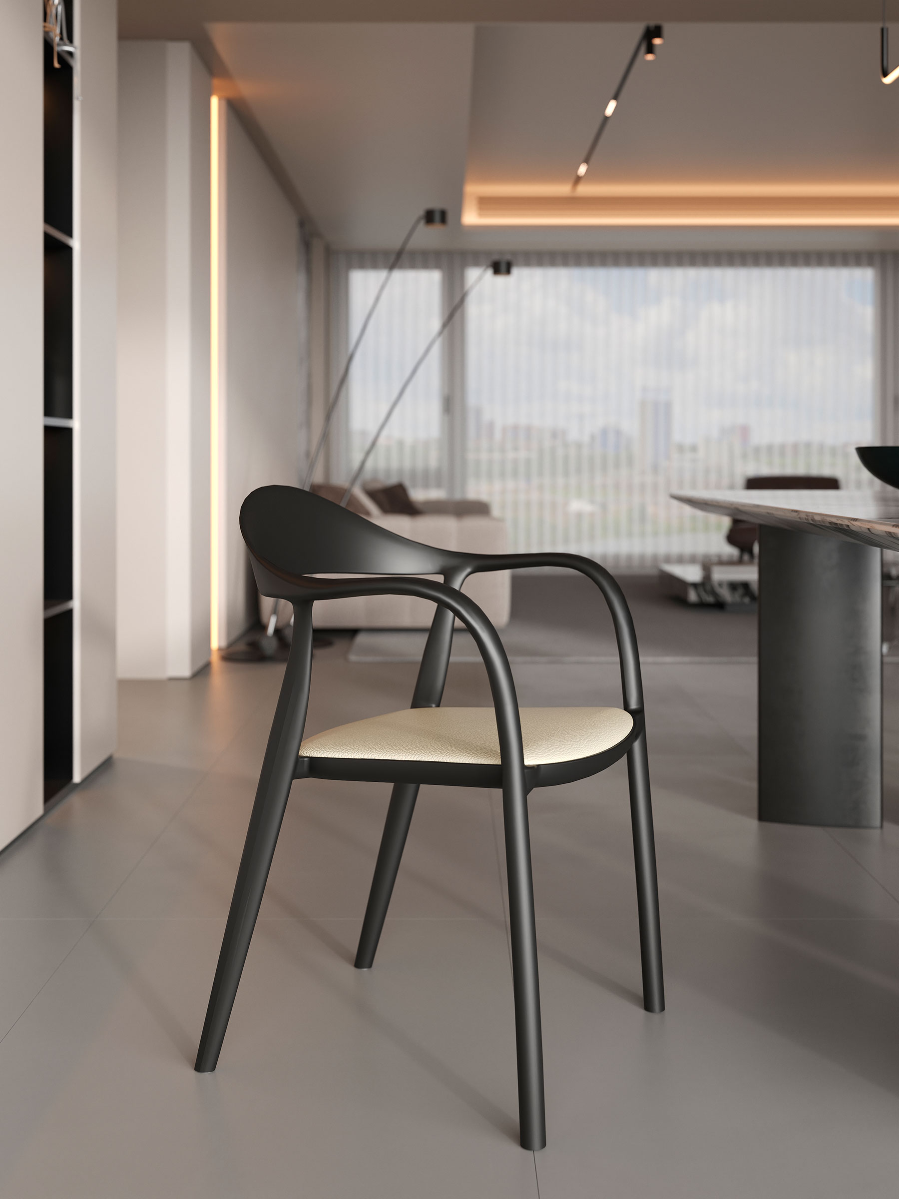 Да — за счёт монолитного силуэта и чистых линий стул органично вписывается в современные пространства и работает как аккуратный дизайнерский акцент.
